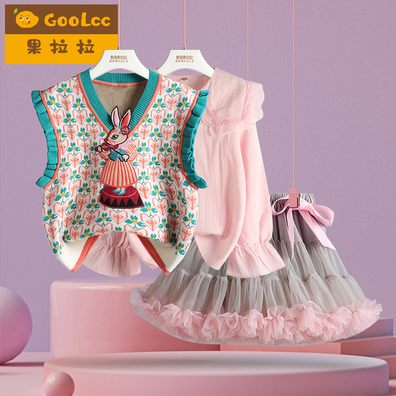 女童三件套裙子2025春秋装新款女宝宝坎肩马甲衬衫tutu裙套装女孩