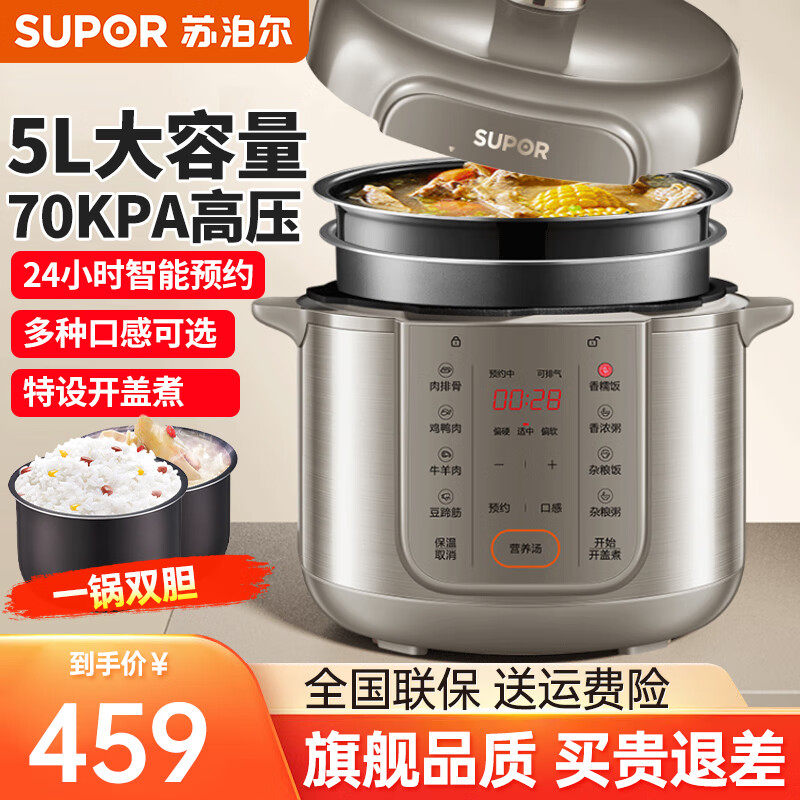 苏泊尔电压力锅5L升大容量多功能手动排气智能预约定时双胆高压锅