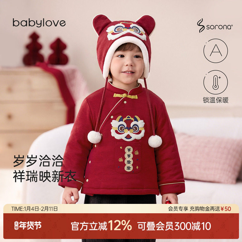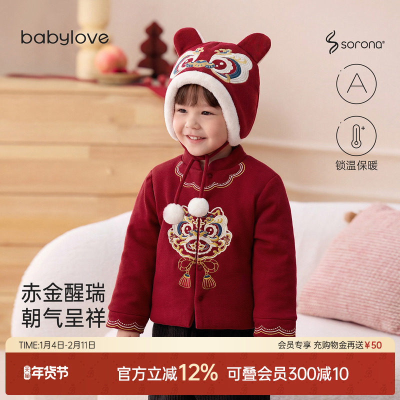 babylove宝宝夹棉外套冬季过年保暖上衣婴幼儿红色拜年服赤金醒瑞