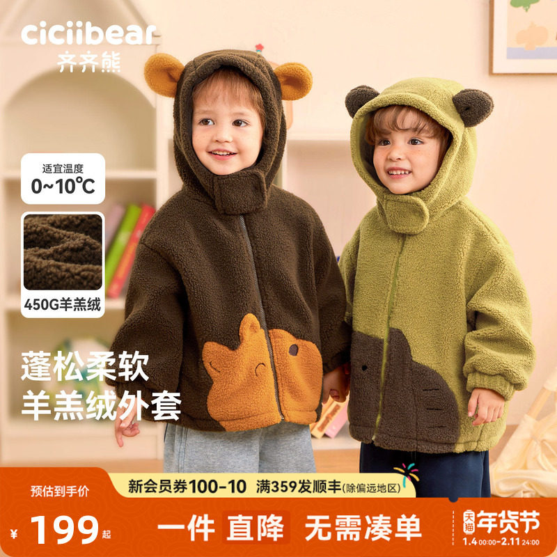 [450g羊羔绒]齐齐熊宝宝夹棉外套男童秋冬款儿童加绒加厚保暖上衣