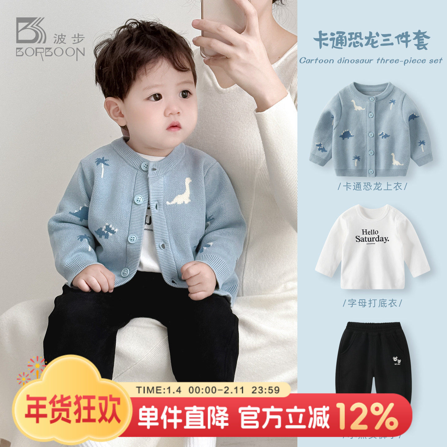 波步婴儿套装春装宝宝针织衫男童衣服洋气开衫上衣儿童分体三件套