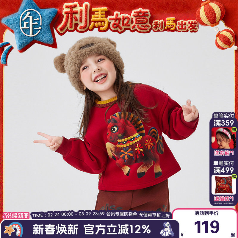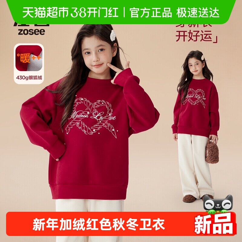 左西童装女童红色加绒卫衣2025新款秋冬季儿童新年服女孩冬装外套