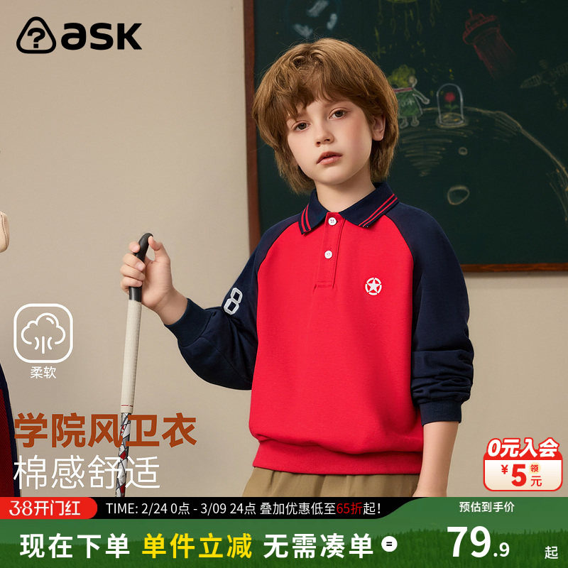 ask儿童卫衣2026春季新款男童POLO领撞色红色学院风中大童长袖
