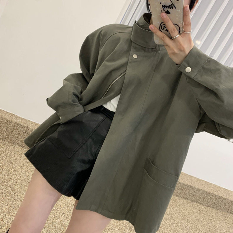 赵露思许妍同款军绿色工装外套女中长款韩系宽松立领复古风衣秋薄