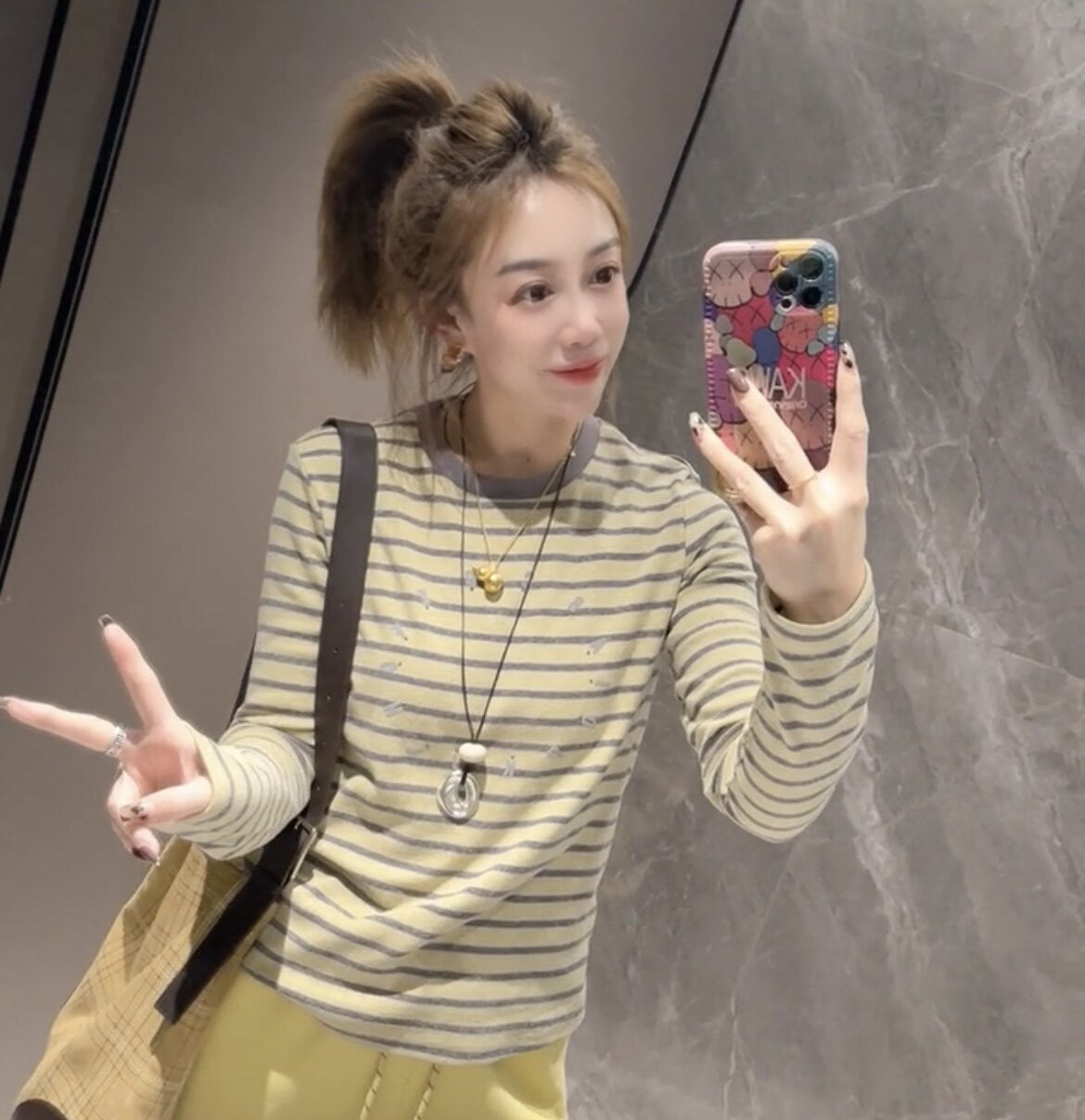 欧洲站2025冬季新款字母拼接条纹长袖t恤女时尚洋气百搭套头上衣