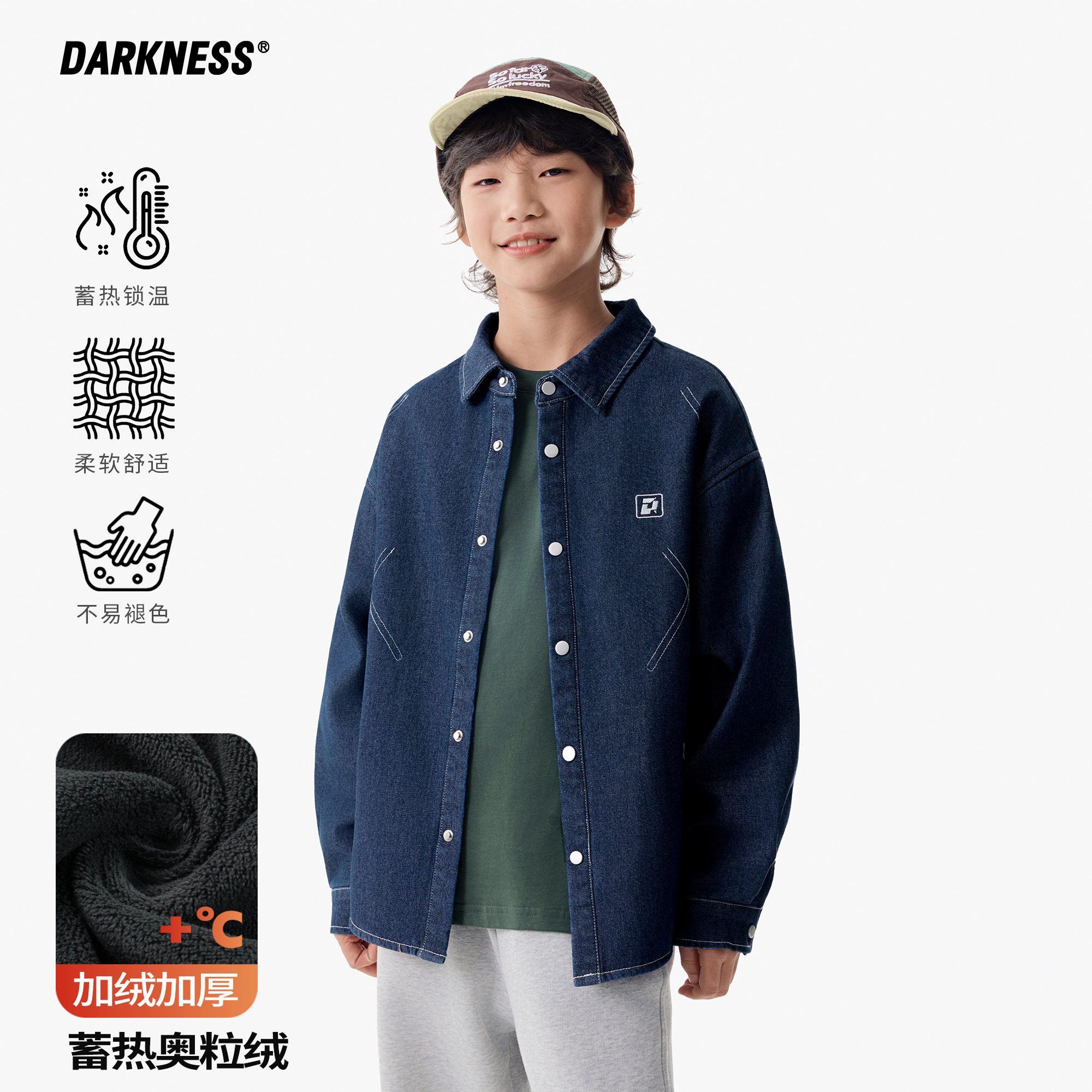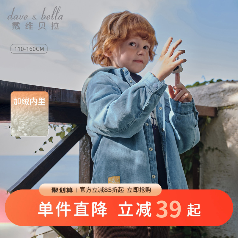 戴维贝拉男童加绒外套中大童连帽衫牛仔衬衫2025冬装新款儿童上衣
