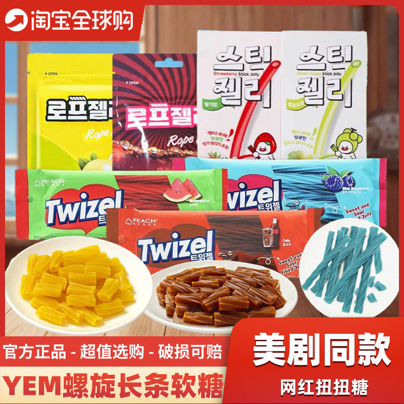 韩国进口YEM长条糖扭扭糖网红橡皮糖果零食酸糖青苹汁果夹心软糖