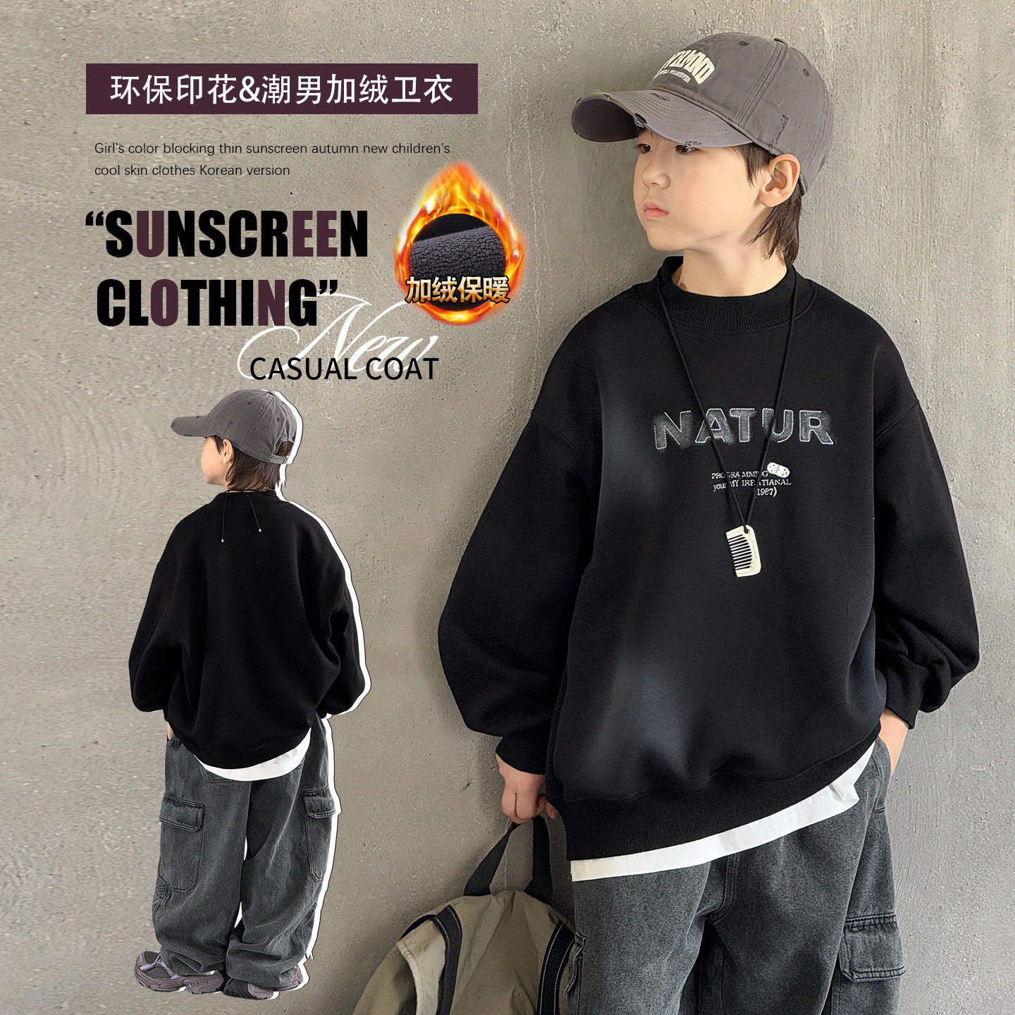 小杰家2025冬季新款韩版男童字母加厚加绒卫衣中大童保暖上衣潮