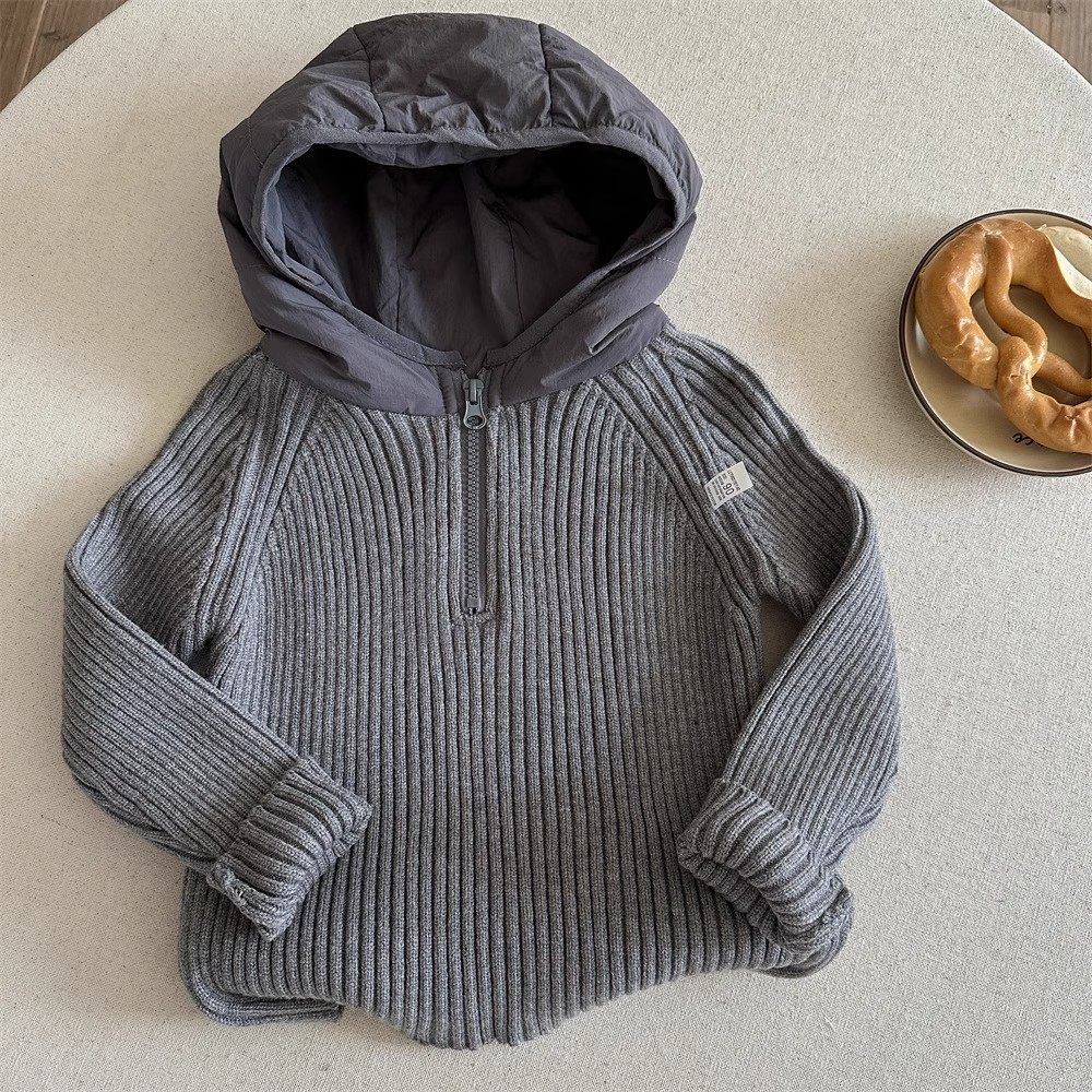 2025秋冬新款儿童男童拼接连帽韩版设计百搭毛衣半拉链卫衣上衣潮
