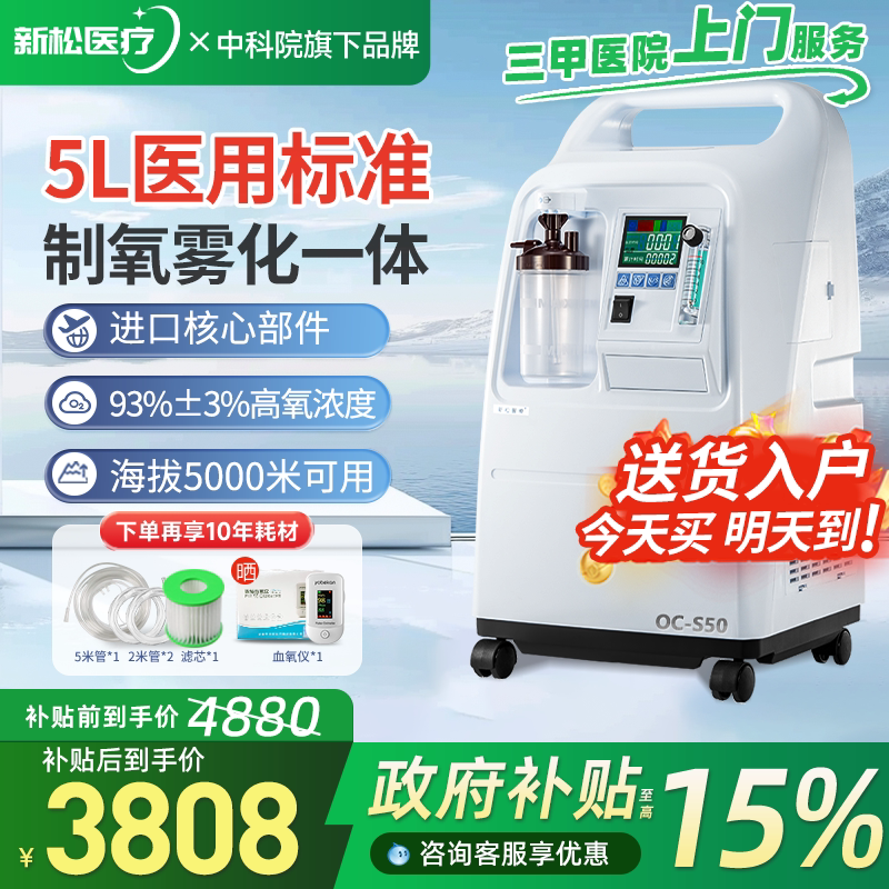 【医院同款】新松5L升医用制氧机家用老人吸氧机雾化氧气机OC-S50