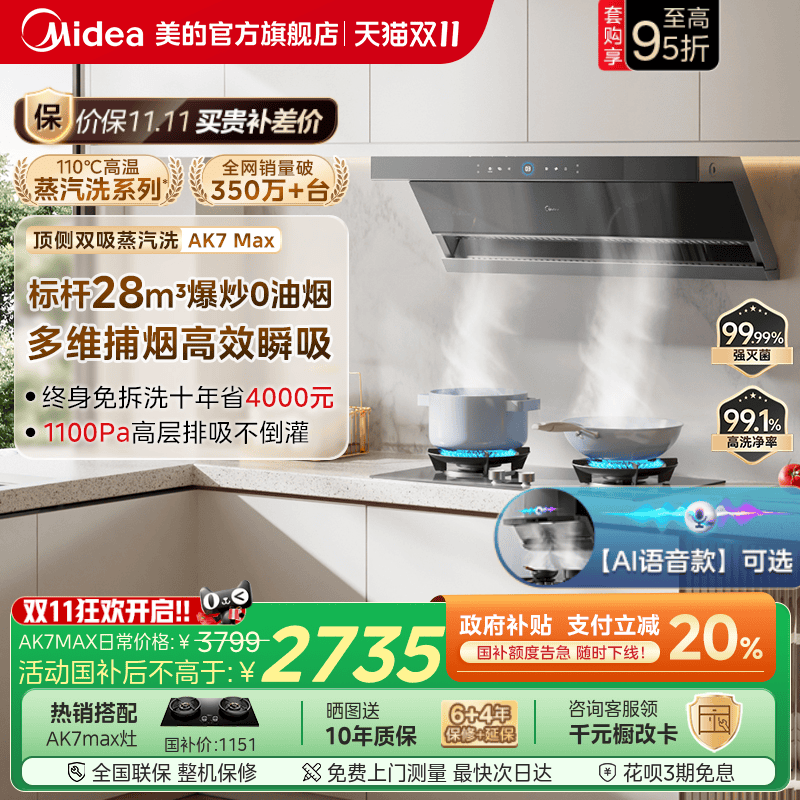 [顶侧双吸]美的蒸汽洗AK7MAX油烟机家用厨房大吸力AK5MAX官方旗舰