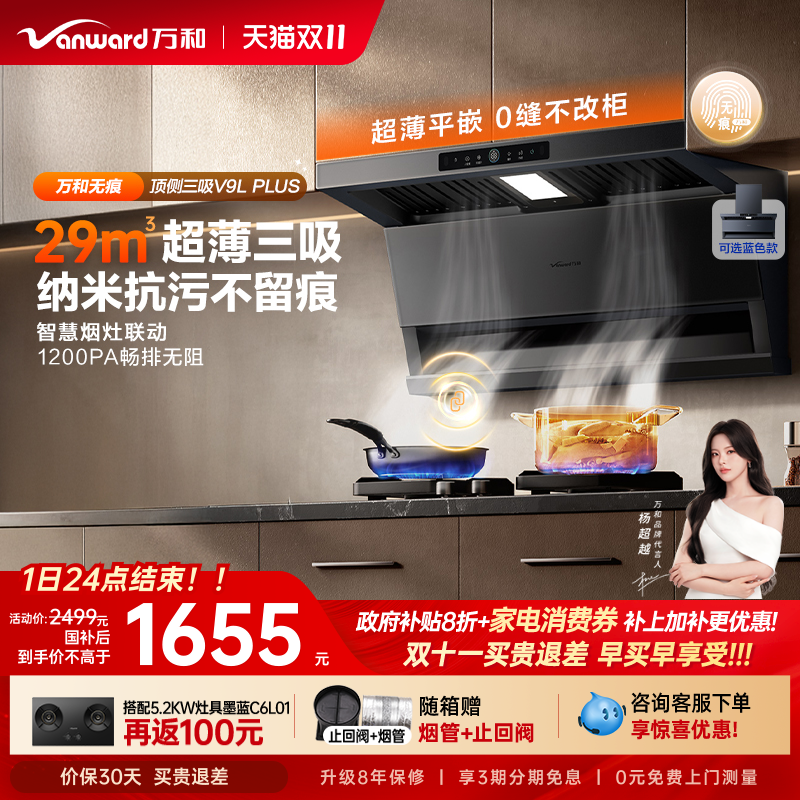 [政府补贴]万和无痕新品顶侧三吸抽油烟机厨房变频油烟机V9LPLUS