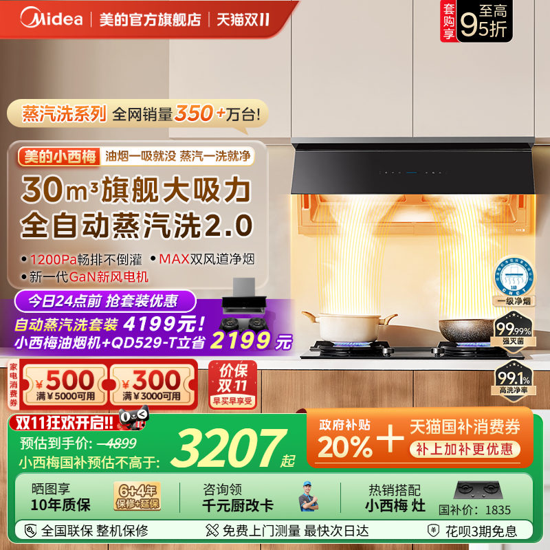 【旗舰新品】美的小西梅油烟机家用厨房顶侧超薄大吸力蒸汽洗2.0
