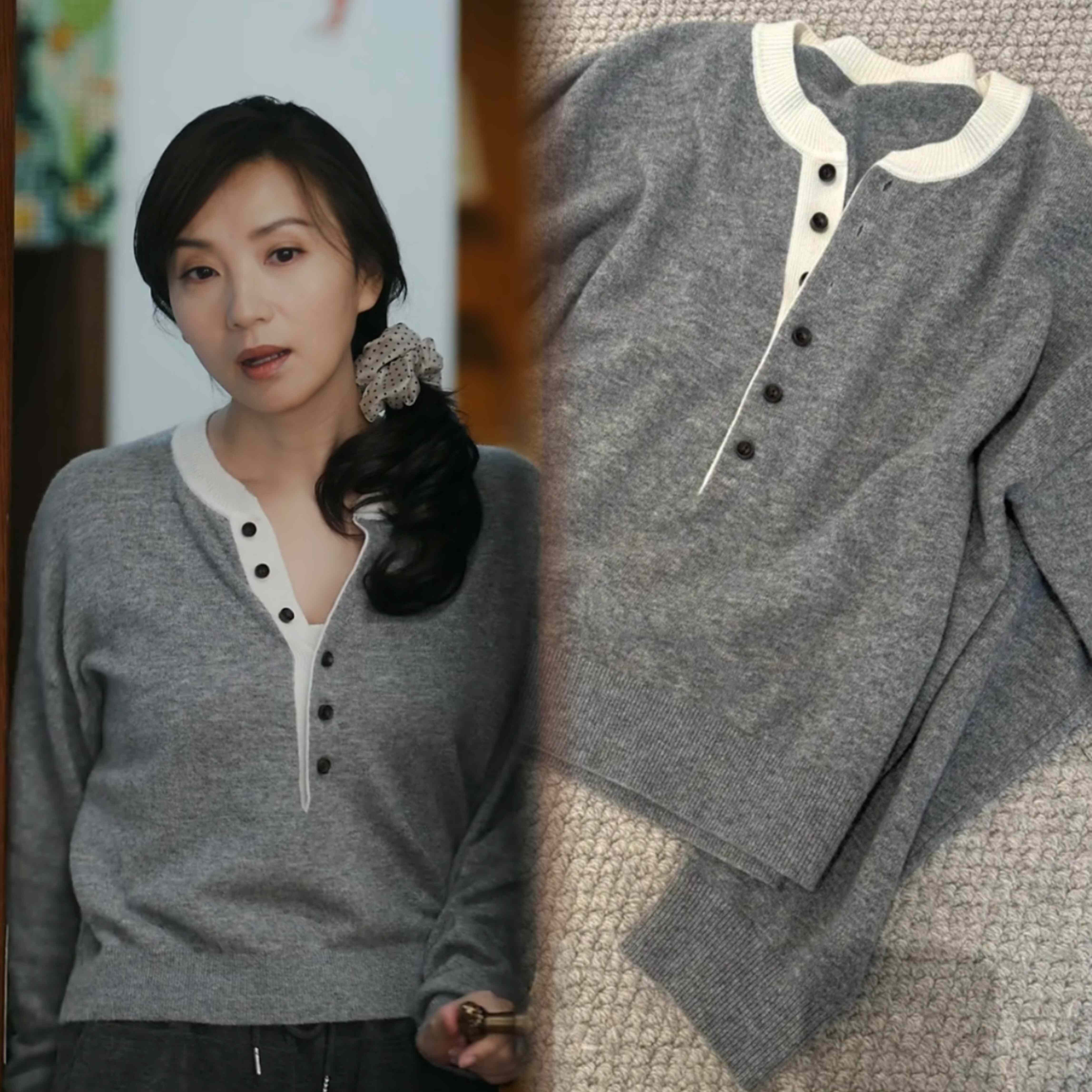 文琪明星同款纯羊毛衫女格雷系半开襟纽扣V领套头羊绒打底衫宽松