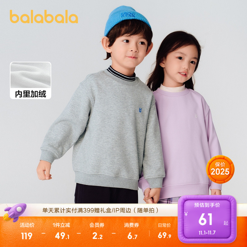 巴拉巴拉童装儿童卫衣男童2025秋冬装女童加绒圆领摇粒绒加厚上衣