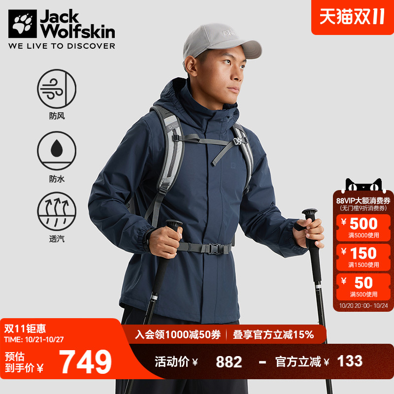 JackWolfskin狼爪男士户外徒步防风防水拼接内胆三合一冲锋衣外套