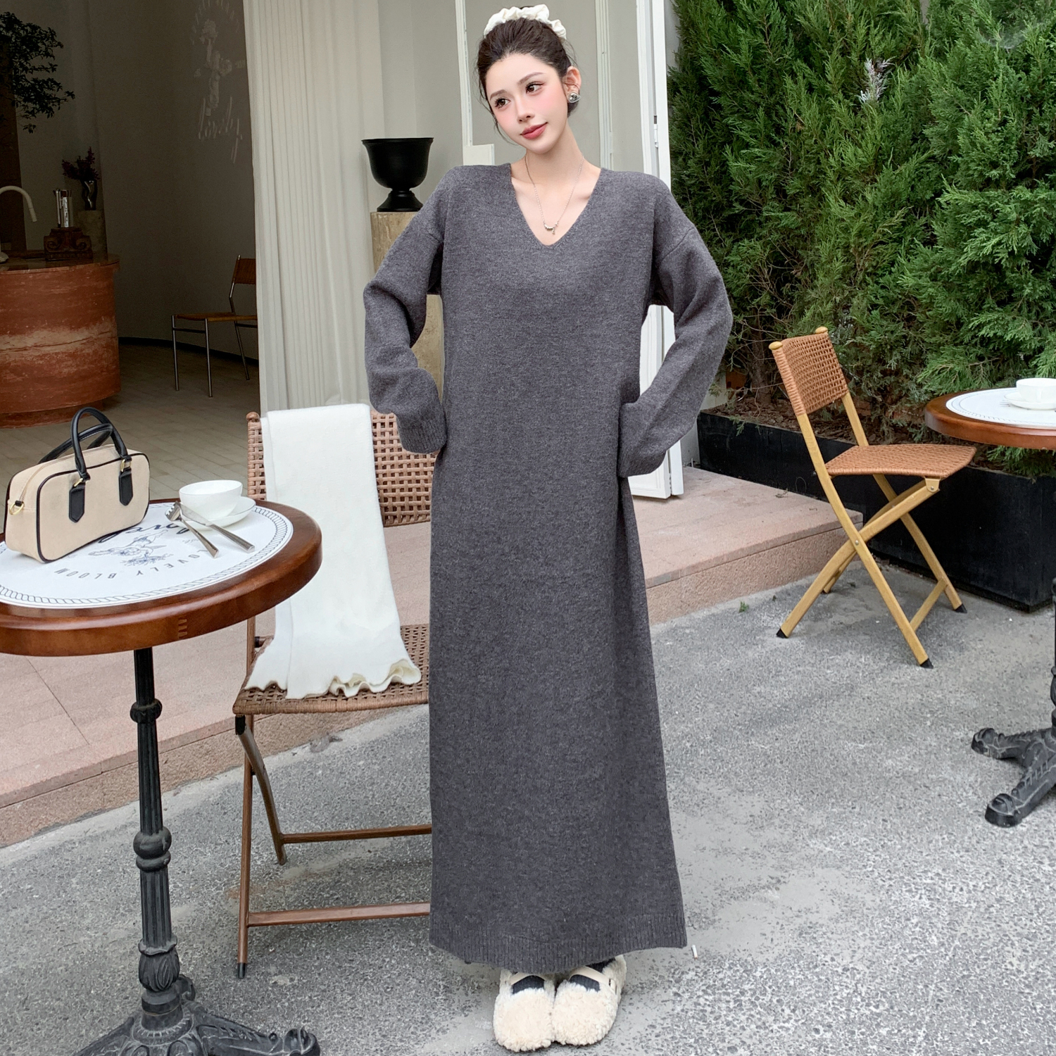秋冬新款大码女装胖mm宽松显瘦慵懒风毛衣裙女韩版V领针织连衣裙