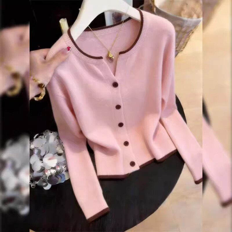 2026春秋季新款女士慵懒风松弛感针织开衫小个子甜美粉色打底上衣