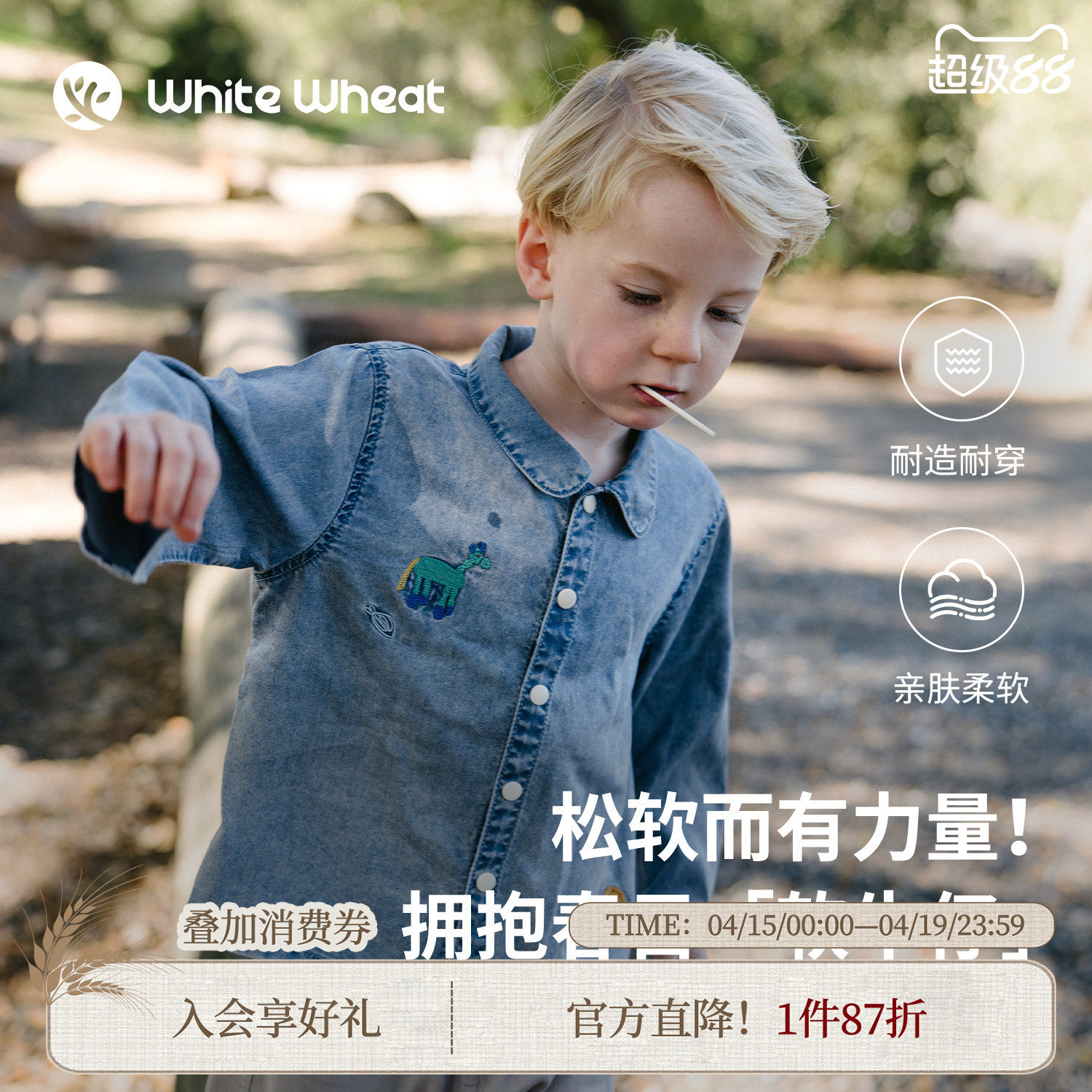 whitewheat【亲肤柔软】儿童26春季新款衬衣男童女宝刺绣牛仔外套