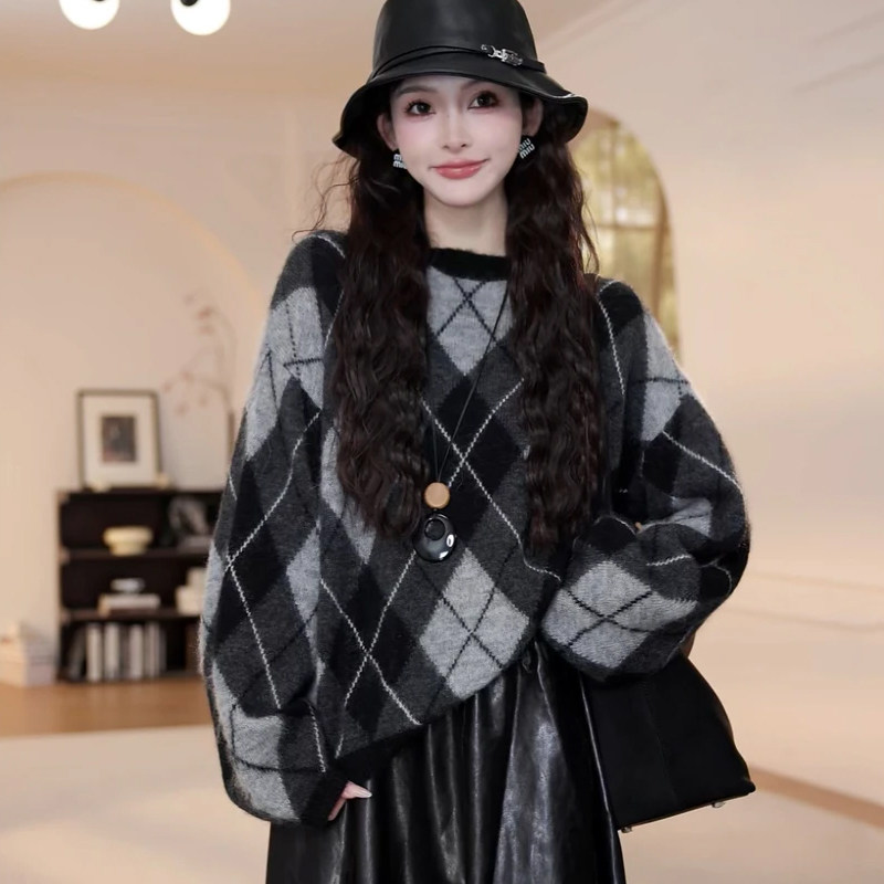撞色棱形格子海马毛毛衣女秋冬季宽松软糯慵懒风套头针织长袖上衣