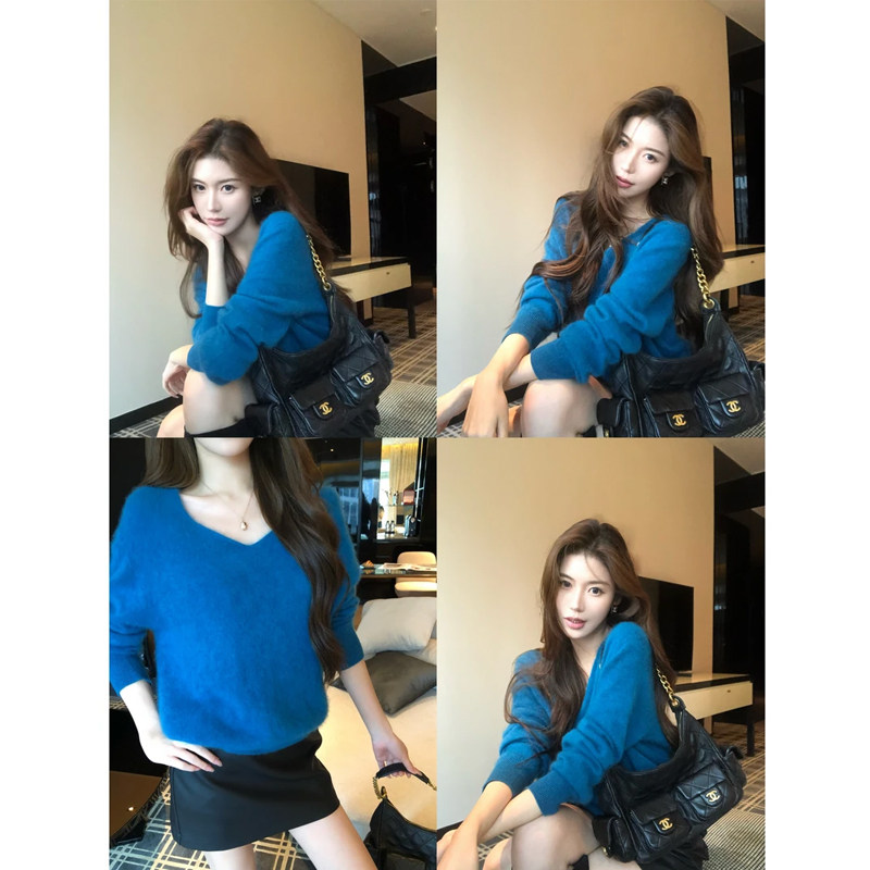 专柜秋冬韩版V领海马毛衣女士宽松仿水貂绒针织打底单穿套头上衣