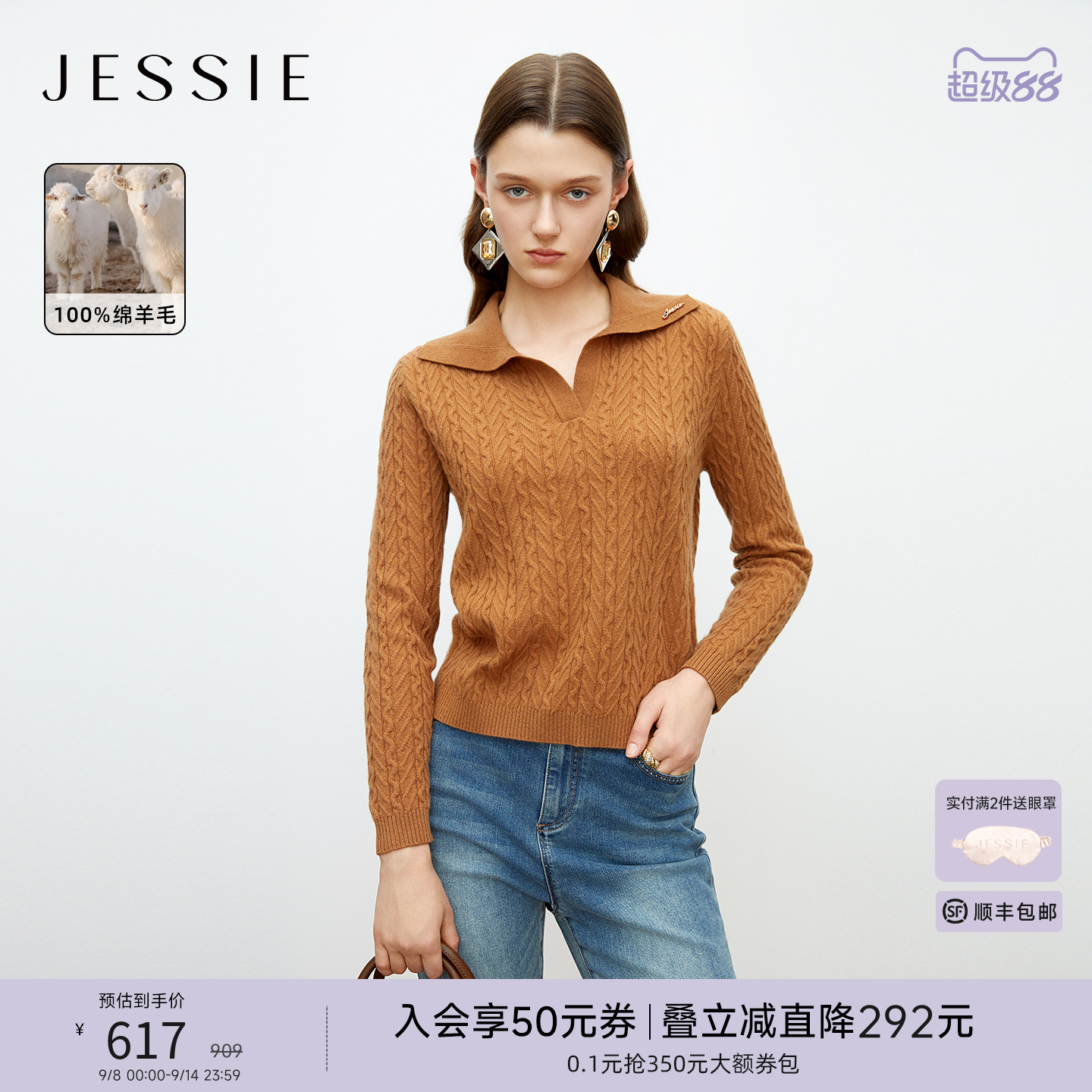 【100%绵羊毛】JESSIE翻领麻花针织毛衣女长袖修身上衣25年秋新款