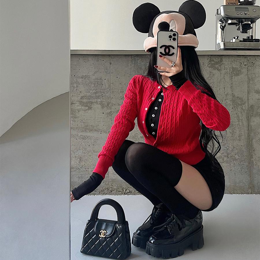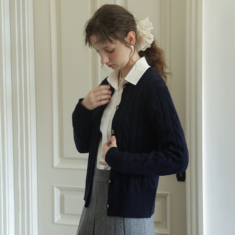 pusumede 头号甜心 复古圆领麻花毛衣开衫外套女气质针织衫上衣