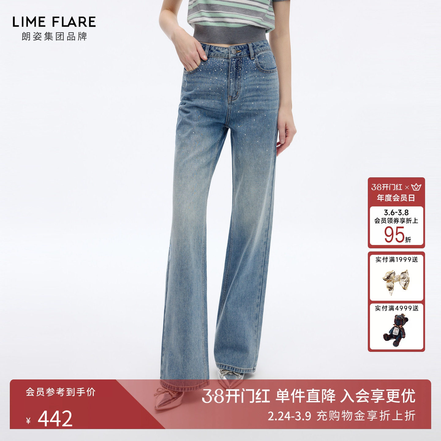 朗姿莱茵福莱尔棉100%复古烫钻破洞牛仔裤女高腰直筒裤26夏新款