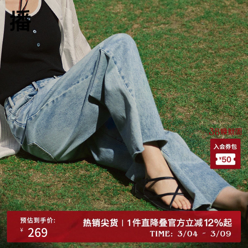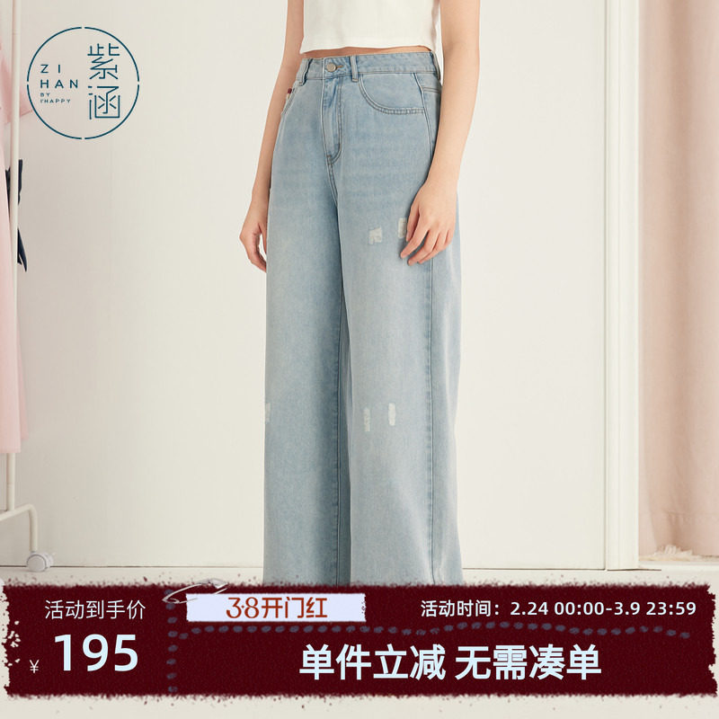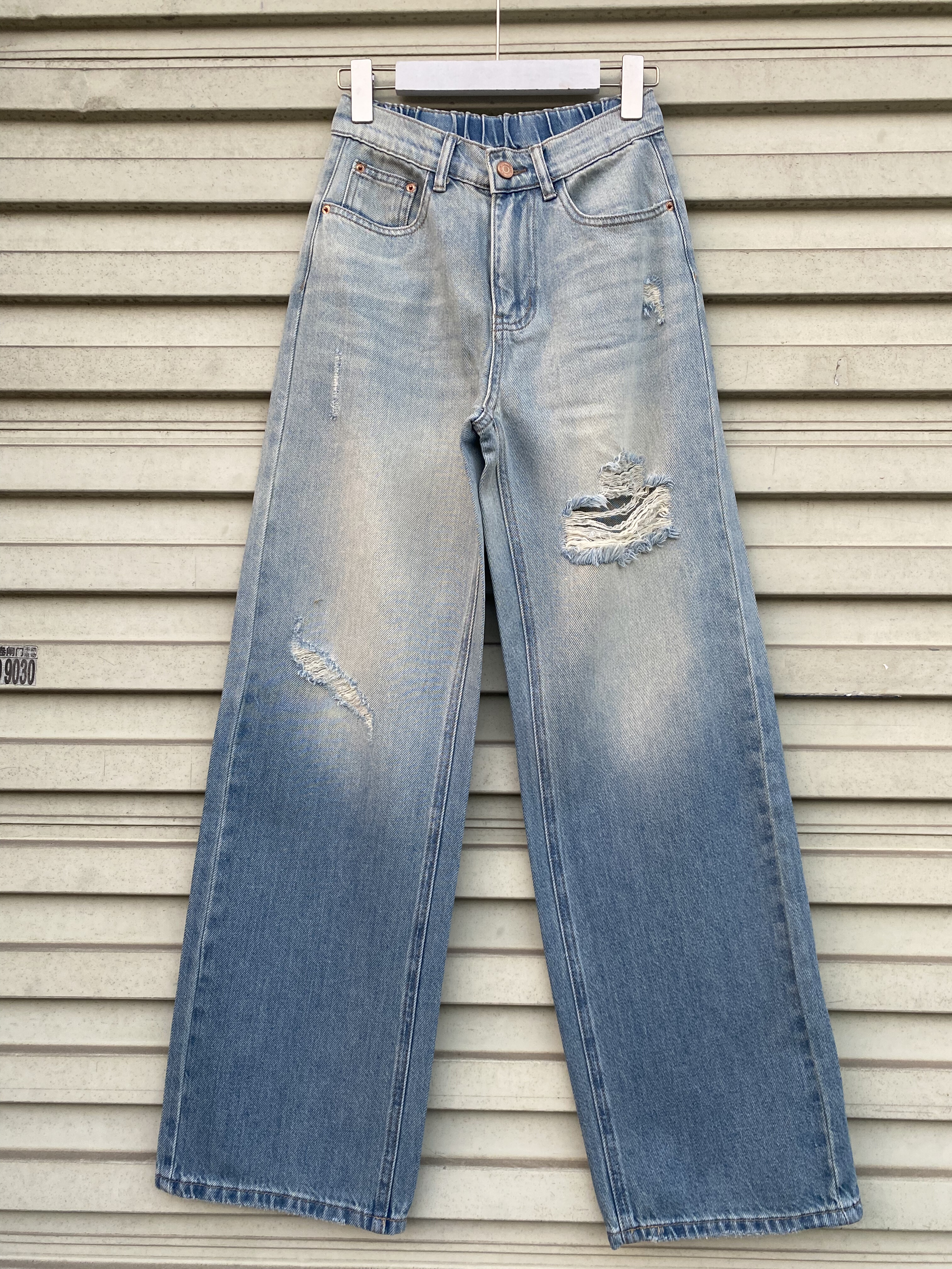播高腰阔腿水洗牛仔裤商场同款破洞做旧宽松淡人直筒裤BDR2KD0831