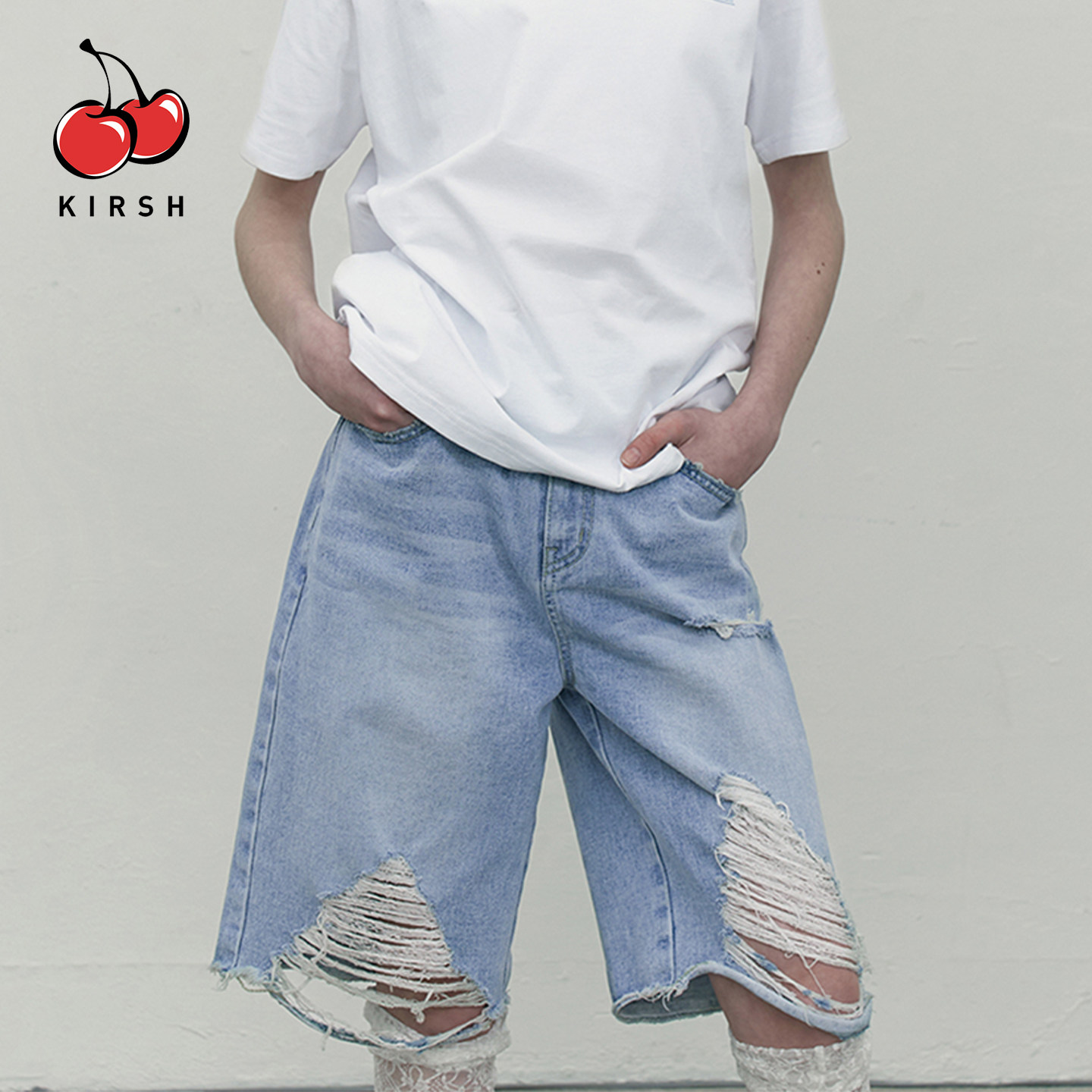 kirsh浅蓝色美式破洞高腰牛仔短裤女夏2026潮宽松休闲中裤五分裤