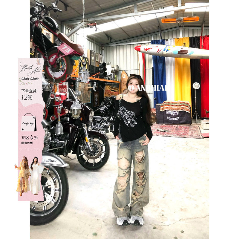 美式复古做旧破洞牛仔裤女2025年春夏季新款高腰直筒宽松阔腿裤子