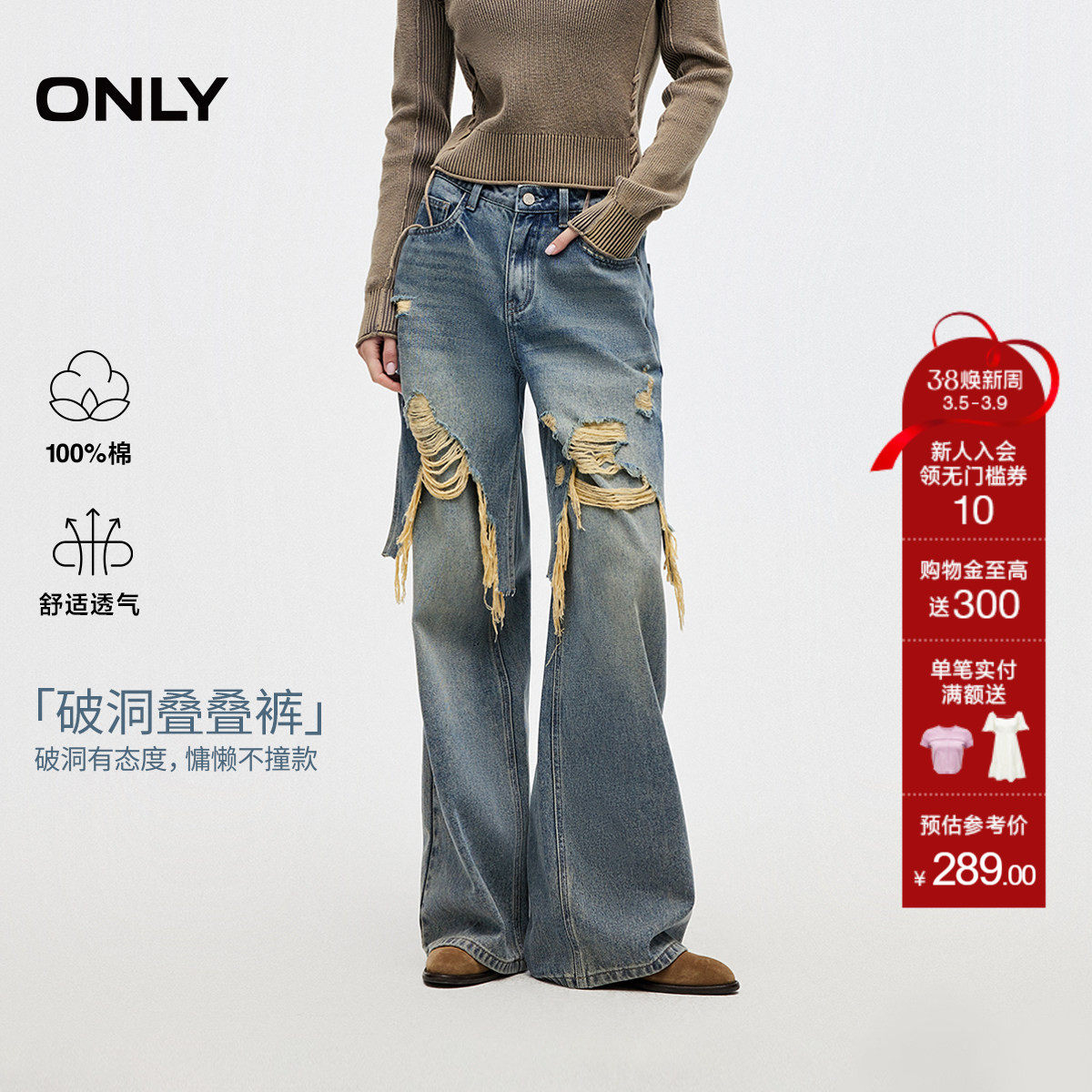 ONLY春季潮流高腰复古街头慵懒风层次拼接破洞宽松直筒牛仔裤