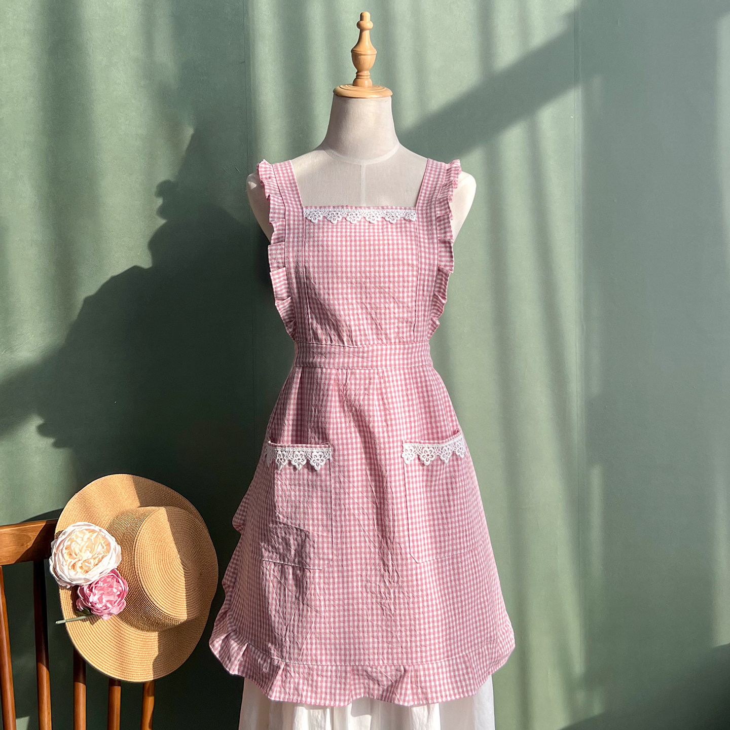 韩版格子背带围裙女厨房家用防污荷叶边蕾丝公主做饭罩裙甜美工作