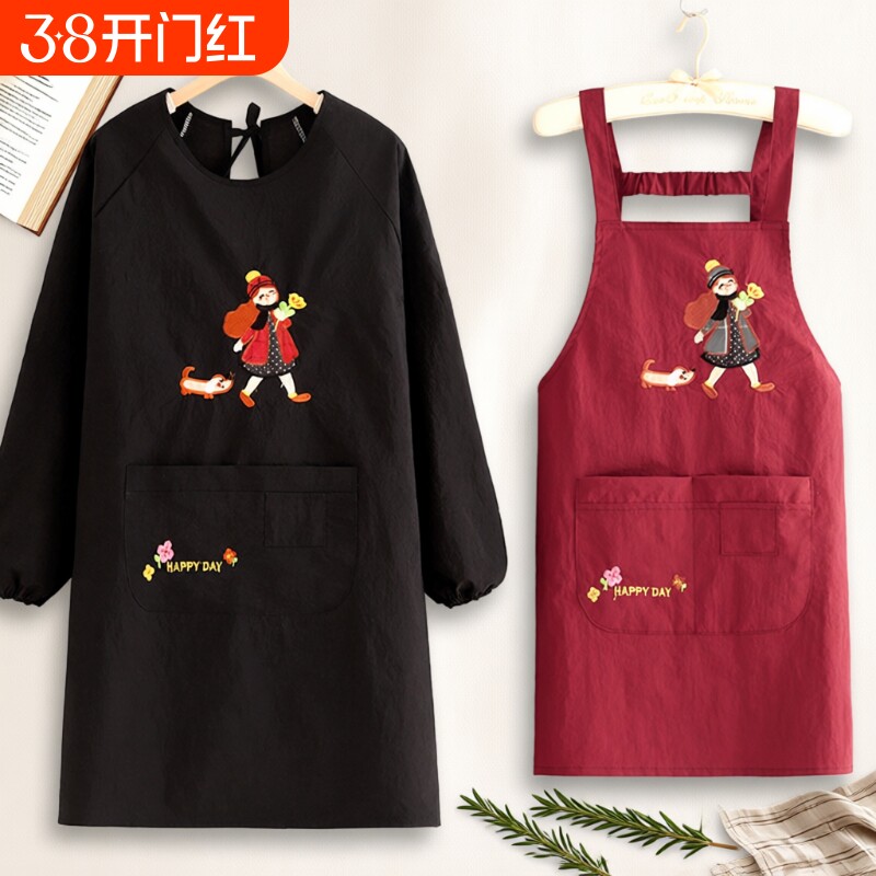 厨房围裙女纯棉擦手长袖背带围腰防油防污韩版大人网红罩衣工作服