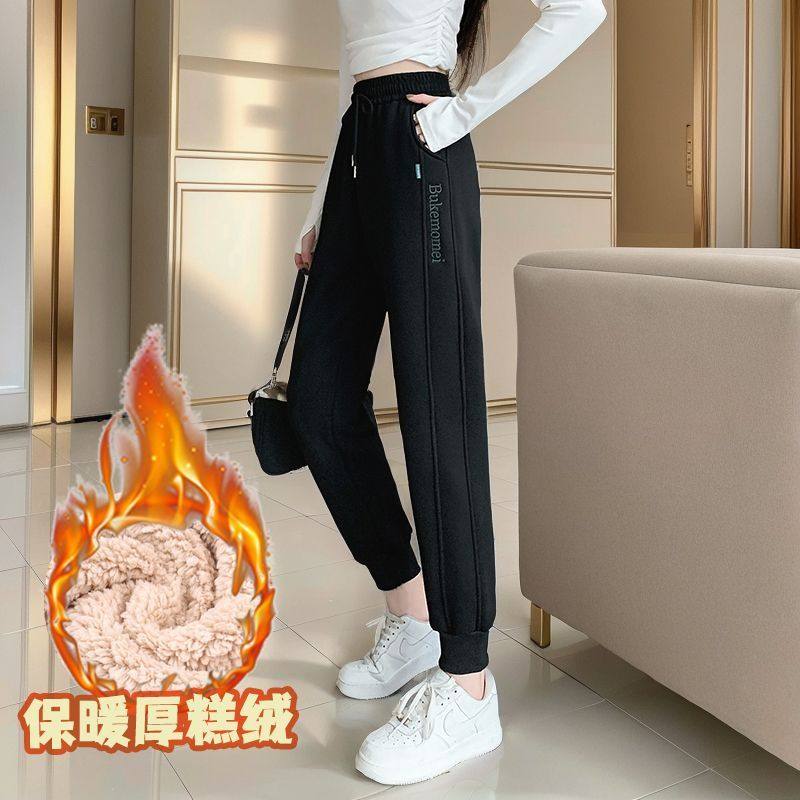 加绒加厚特厚保暖哈伦裤女2024冬季新款韩版刺绣拼接宽松显瘦卫裤