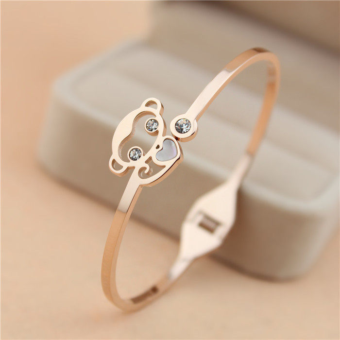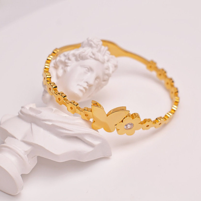 18k金饰品韩版大蝴蝶钛钢玫瑰开口钢直镶钻锆石女钛18手镯大女大