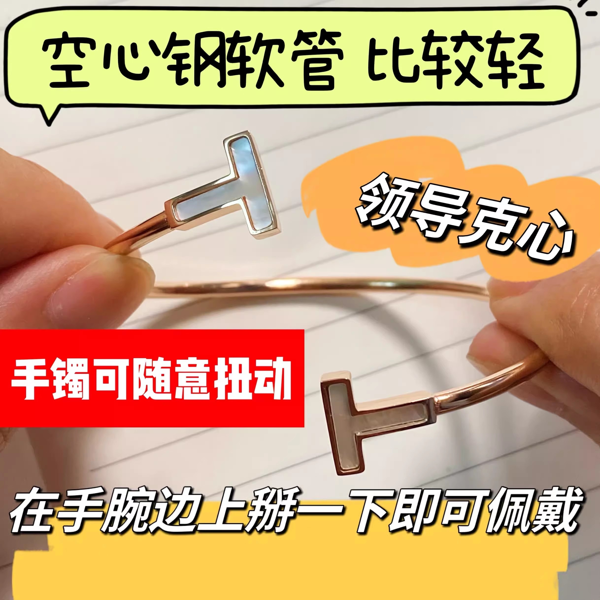 明星同款T手镯领导克星显白时尚白母贝镶钻钛钢镀18K玫瑰金手环女