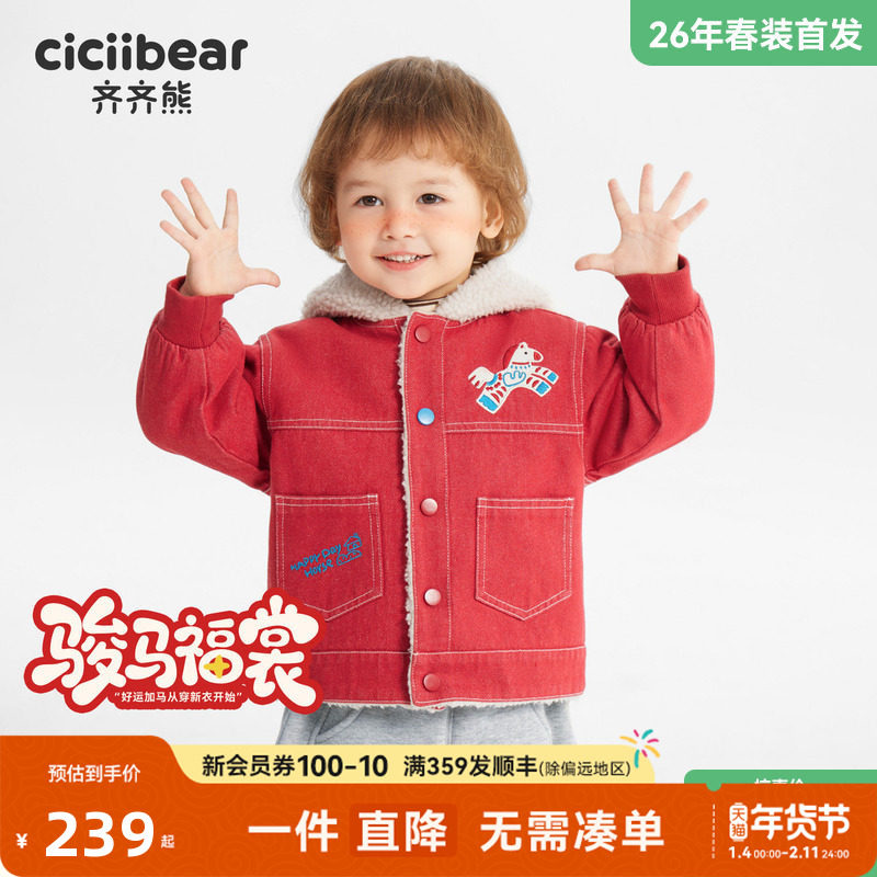 [骏马福裳500G羊羔绒]齐齐熊宝宝加绒牛仔外套男童新年红色儿童装