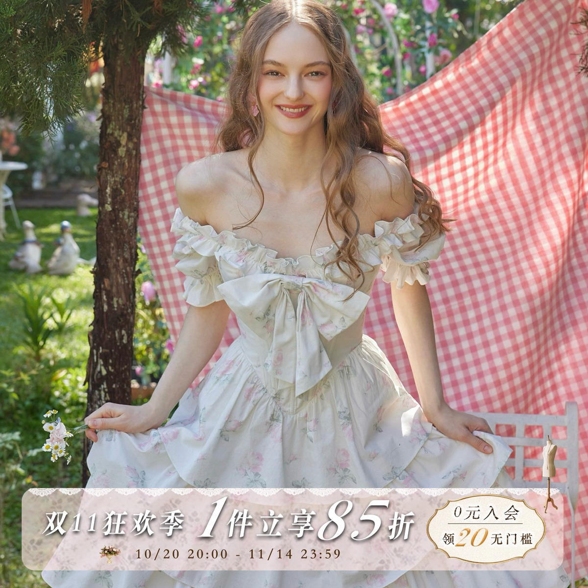 LaceMade 甜花珊瑚岛 定制面料复古田园印花蝴蝶结鱼骨连衣裙