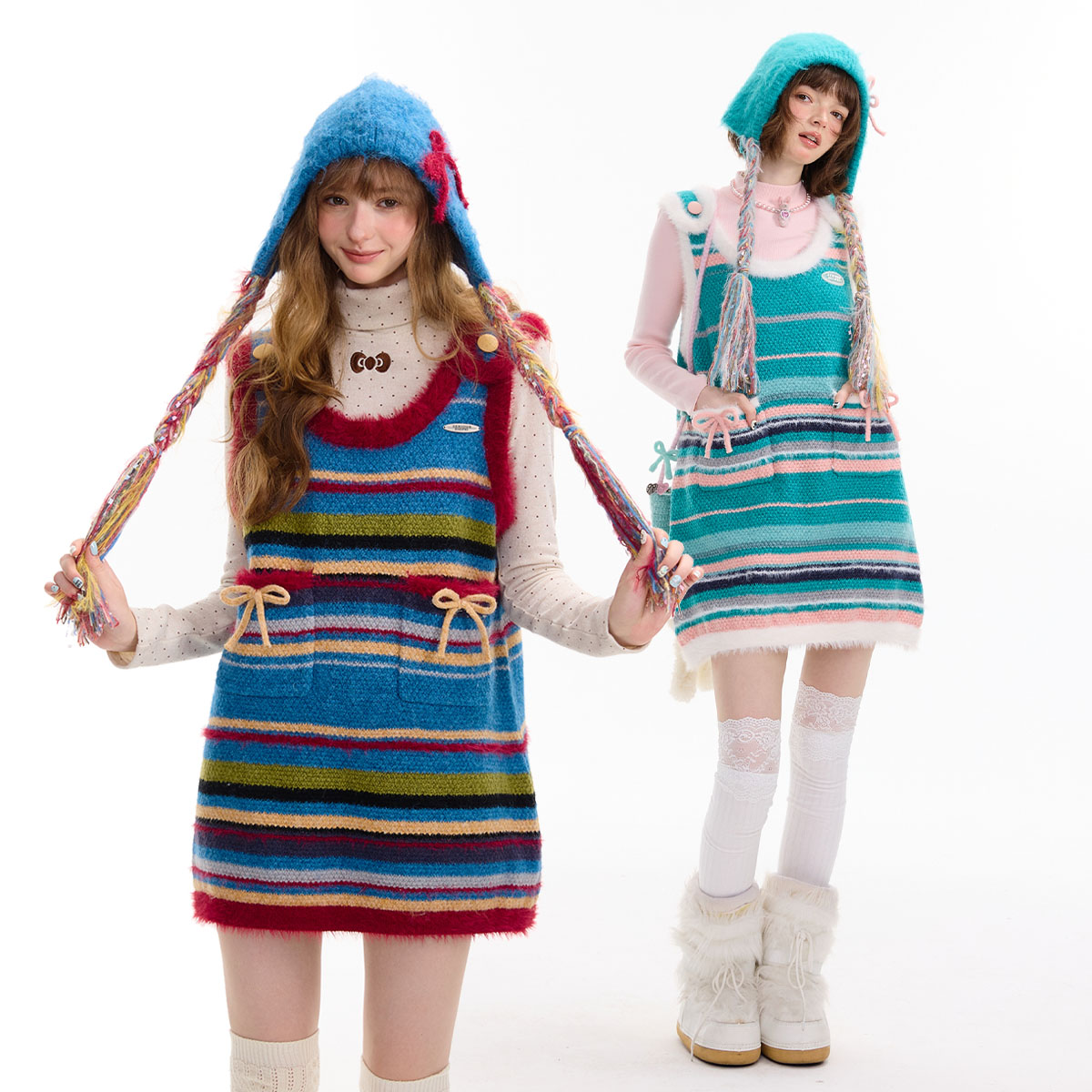ziziFei秋冬美式复古新款设计感条纹蝴蝶结针织打底背心连衣裙女
