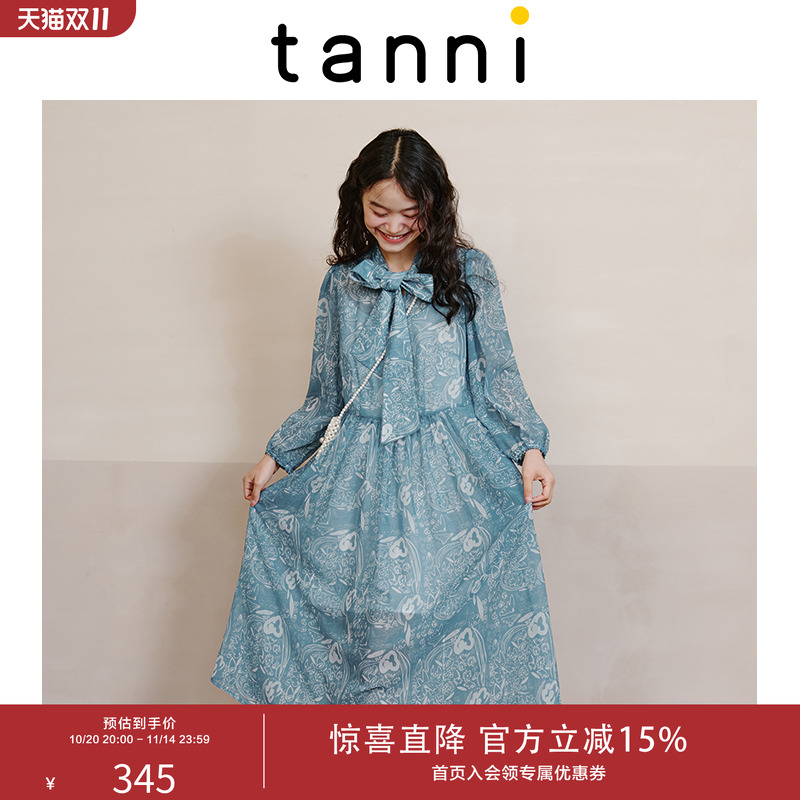 tanni欧美复古印花蝴蝶结连衣裙秋新品收腰中长裙TL31DR043A