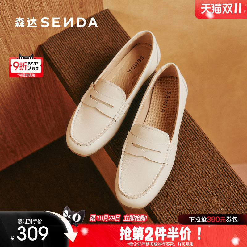 森达白色乐福鞋女鞋新款商场同款牛皮舒适通勤皮鞋平底鞋黑色单鞋