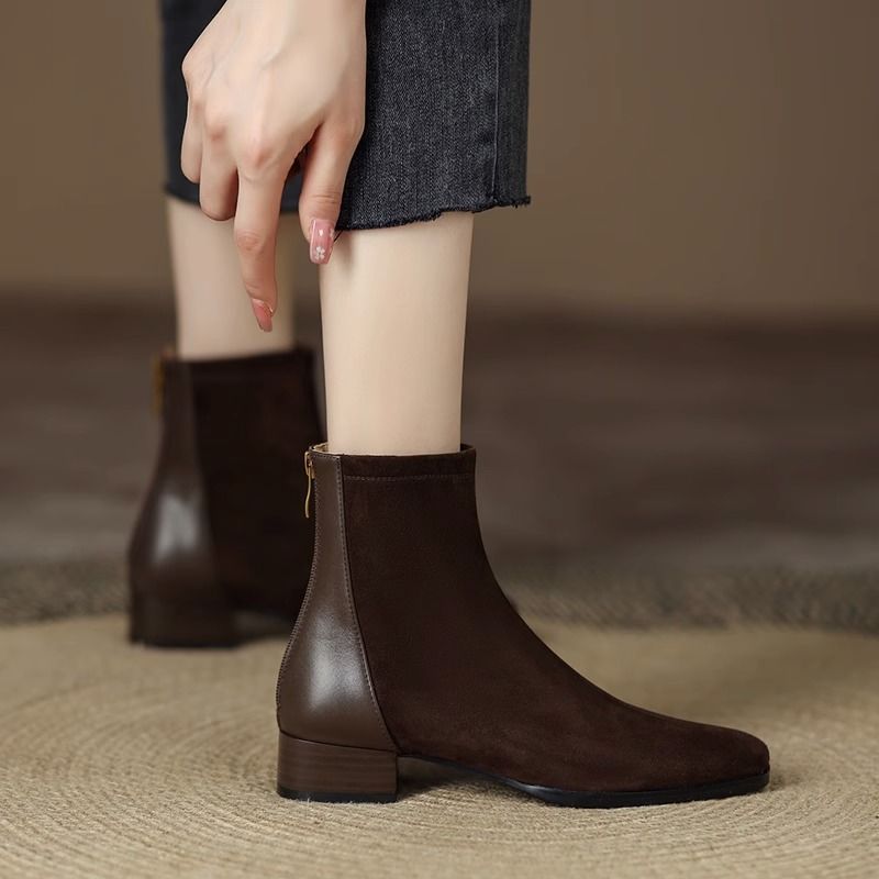 2025新款粗跟女式棕色短靴女春秋单靴磨砂低跟气质百搭方头马丁靴