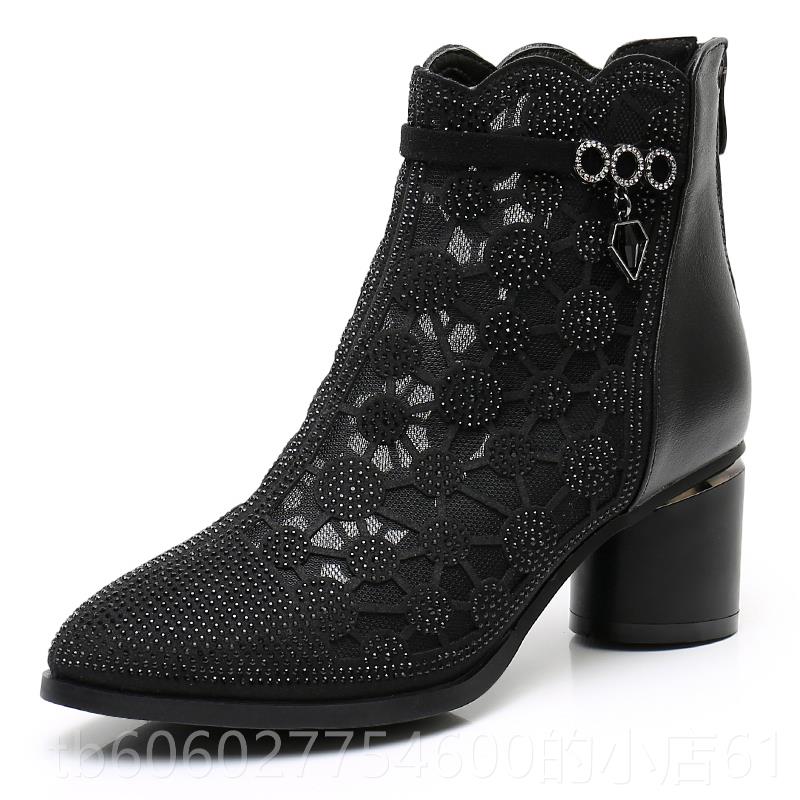 短靴女春秋单靴时尚带钻2792纱网妈跟妈鞋中真皮靴粗跟洋气子女士
