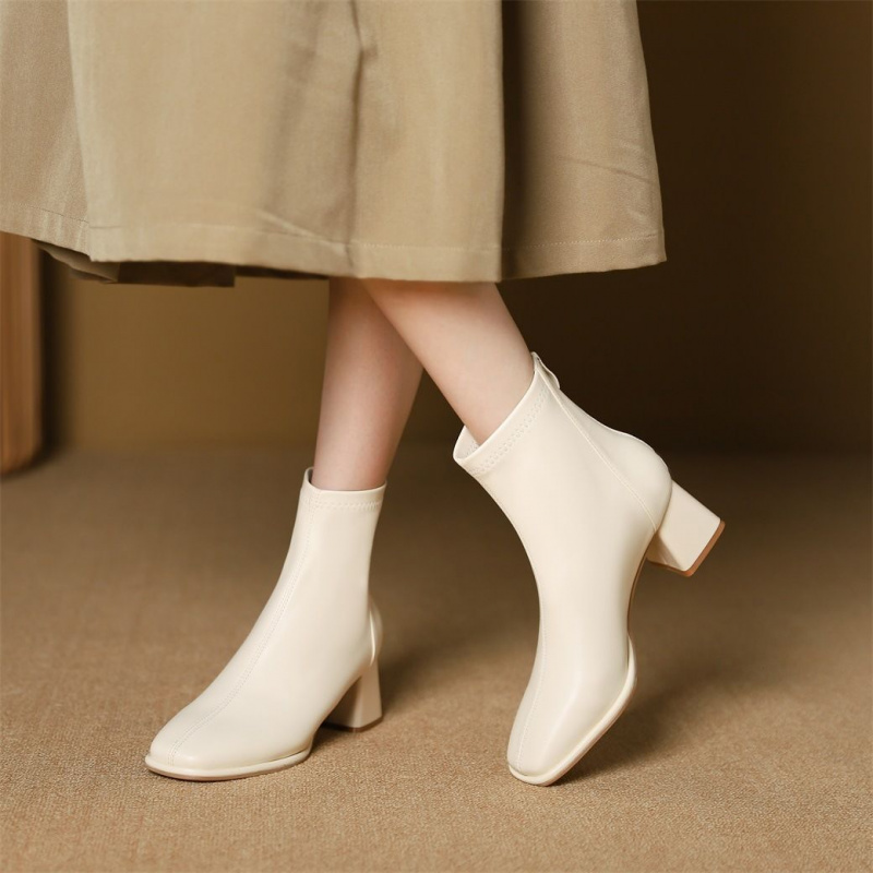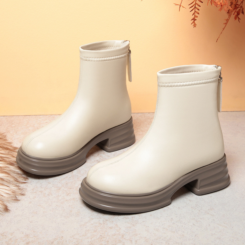 法式马丁靴米白中跟短靴春秋单靴粗跟女士切尔西靴秋冬加绒瘦瘦靴
