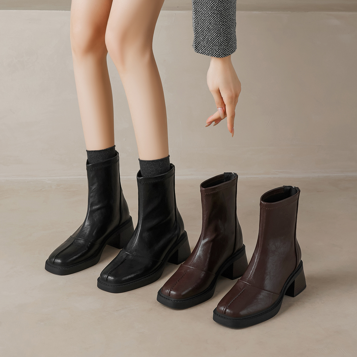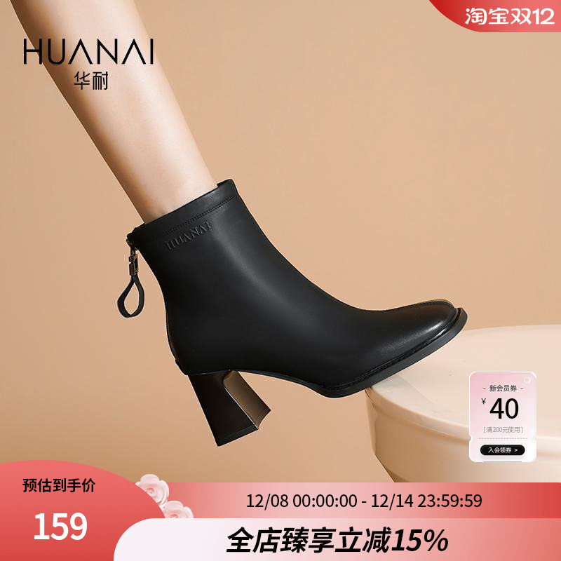 华耐秋冬短靴踝靴粗跟时装靴方头皮靴2025新款高跟女士春秋单靴