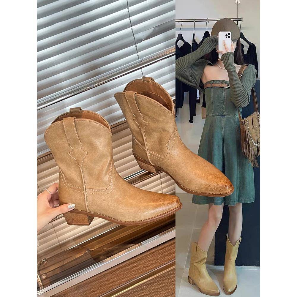 香港覆古英伦风格女式短靴2025春秋季新时尚尖头单靴小粗跟西式靴