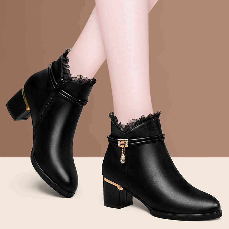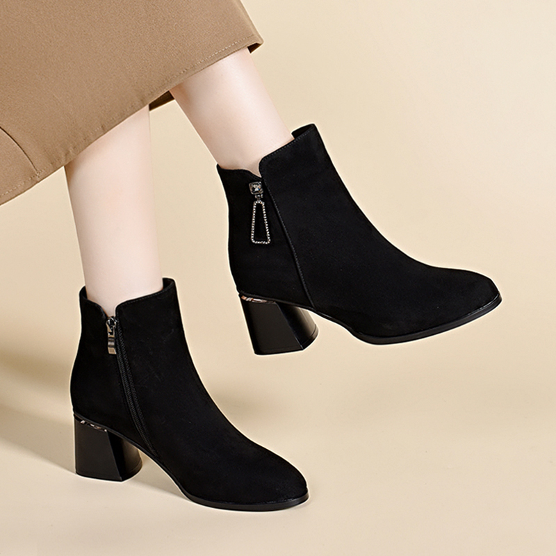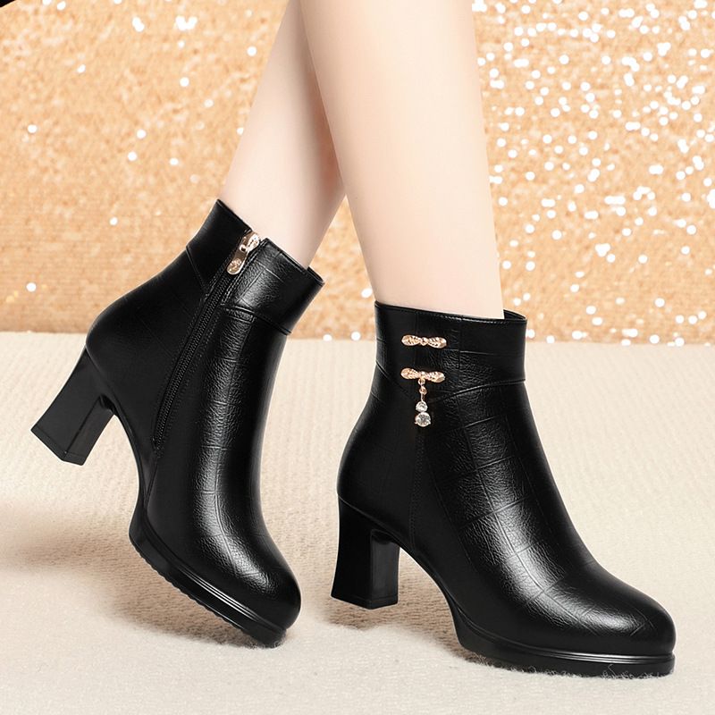 水钻女士小短靴舒适中粗跟百搭春秋单靴新款妈妈鞋加绒棉靴子通勤