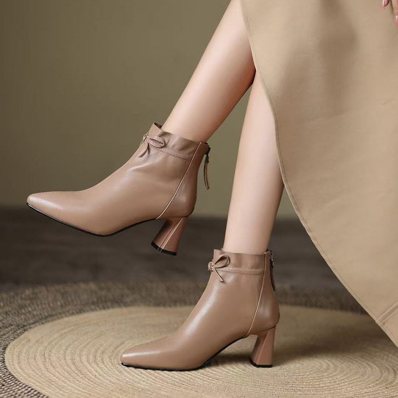 羊皮尖头高跟女士真皮短靴女2025年秋新款配裙子时尚粗跟春秋单靴