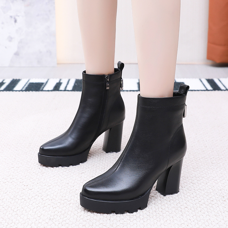 春秋真皮单靴2023年秋冬新款防水台女士皮靴高跟粗跟加绒女靴短靴